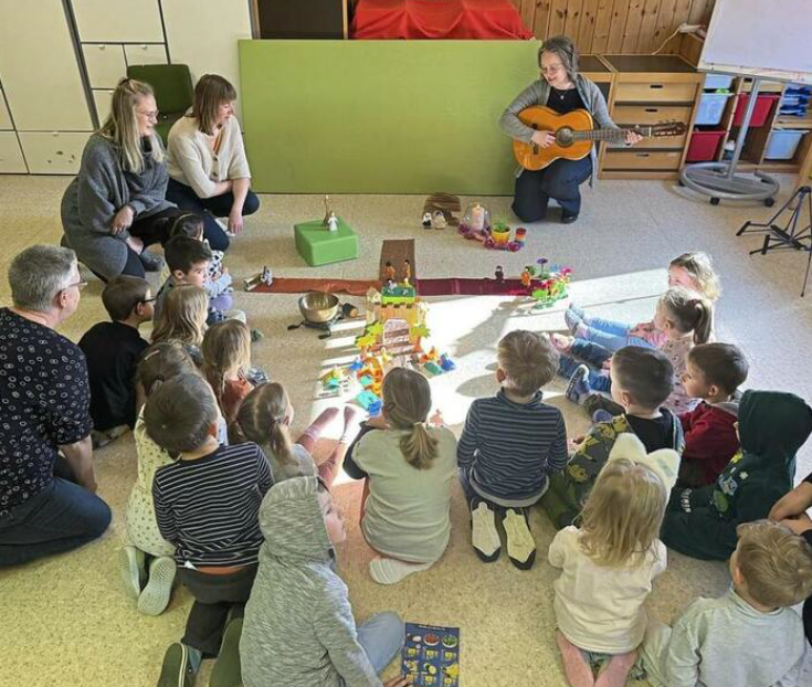Einmal in der Woche gibt es in der Evangelischen Kindertagesstätte in Usseln ein religionspädagogisches Angebot. Ein Viertelstündchen dauert diese Einheit, in der die Kinder neue Themen und Lieder entdecken. Oft begleitet Pfarrerin Diener die Kinder beim Singen mit der Gitarre. Und in dieser Zeit gibt es auch noch eine ganz besondere Minute – einfach schweigen und dem Ton der Klangschale zuhören. „Die Kinder merken mittlerweile, wie schön es sein kann, für einen Moment still zu werden und einfach nur zu lauschen“, freut sich Claudia Schlensok.
